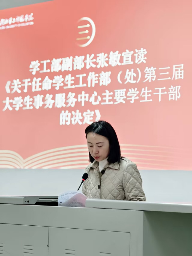 学工部副部长张敏宣读《关于任命学生工作部(处)第三届大学生事务服务中心主要学生干部的决定》。