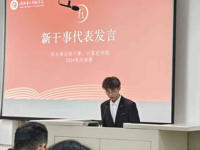 大学生事务服务中心第三届新干事代表、综合事务部干事、计算机学院2024级闵梓康发言,并承诺将以实际行动继承优良传统,发扬精神风貌,用实际行动去书写属于新的精彩篇章。