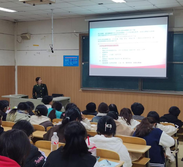 本网讯(通讯员 孙玉凤)为贯彻落实2025年春季征兵宣传工作,鼓励大学生积极参军入伍、建功立业,12月4日,教育科学学院(以下简称“教科院”)开展“国防使命,青年担当”征兵宣讲活动,2022级教育学1班退伍军人潘思远担任主讲人。