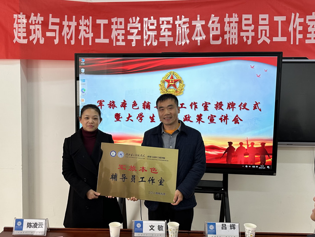 本网讯(通讯员 陈凌云)12月5日下午,建筑与材料工程学院举行2024年“军旅本色”辅导员工作室授牌暨大学生退伍政策宣讲会,副校长吕辉出席并讲话。学生工作部、人民武装部及学院主要负责人,建筑与材料工程学院全体退役大学生士兵参加会议。