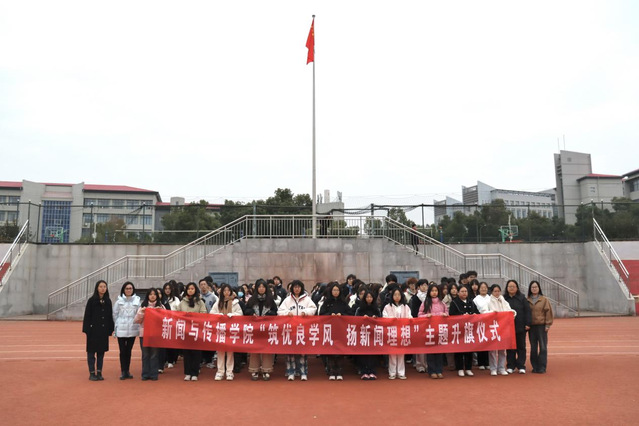 本网讯(通讯员 鄢柠宁)12月9日上午,新闻与传播学院(以下简称“新传院”)于田径场举行2024年“筑优良学风 扬新闻理想”主题升国旗仪式。新传院党总支副书记邱媛、学生成长工作室负责人周敏、团委副书记王一以及2024级全体同学参与。新传院学生工作办公室主任孙蓓主持仪式。
