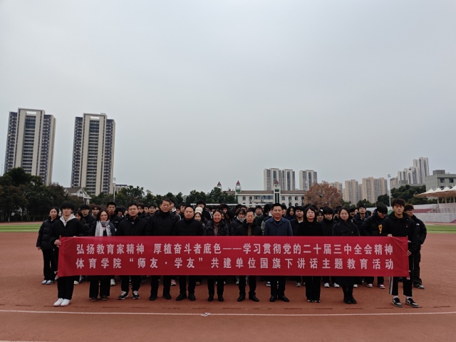 本网讯(通讯员 辛雯)12月23日上午,体育学院隆重举行“师友·学友”共建单位国旗下讲话主题教育活动,本次活动以“弘扬教育家精神 厚植奋斗者底色--学习贯彻党的二十届三中全会精神”为主题。校党委常委、副校长张红梅教授、“师友·学友”共建单位负责人、学院领导班子、辅导员、学院全体党员、入党积极分子、2023、2024年新发展团员、2024级全体新生参加。