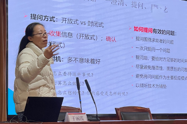 本网讯(通讯员 郑婧)为提升辅导员专业素养与工作技能,12月4日,学生工作部(处)在行政楼五号会议室面向全体辅导员举办了“学思讲堂”第九期辅导员专题培训。培训邀请了华中师范大学心理健康教育中心副主任、副教授于丽霞,以“辅导员谈心谈话技巧”为题进行讲授,学生工作部副部长刘兴主持培训会。