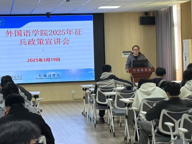 本网讯(通讯员 章缙 李祖平)为积极响应国家征兵号召,激发广大学子参军报国热情,外国语学院于2025年3月19日,在学院多功能报告厅成功举办2025年征兵宣讲会,全体在校男生参加。本次宣讲会由学院征兵工作负责人章缙老师主持,学院学工办主任李祖平老师受邀出席并分享自身入伍经历。