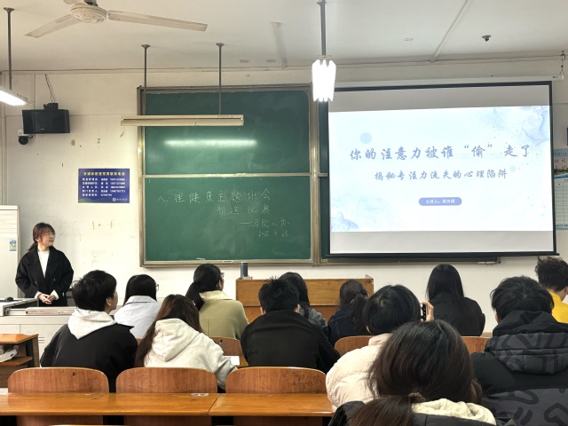 2024级思想政治教育2班梁芳萌着眼于“记得注意力被谁‘偷走’了,揭秘专注力流失的心理缺陷”。她从四大心理学角度揭秘生活中常见的注意力不集中的例子,又给出了夺回注意力的科学应对策略,最后她给大家提供了专属行动计划。