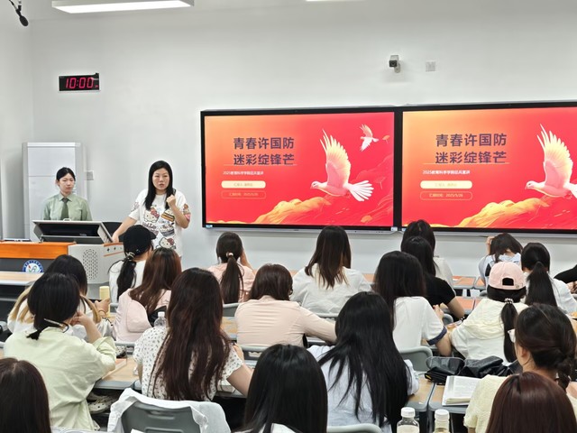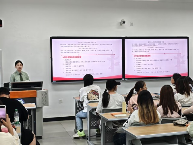 随后,潘思远围绕大学生入伍核心内容展开系统宣讲,她详细介绍了大学生参军入伍国家资助、部队培养以及退役后考研加分、专项硕士研究生招生、就业创业服务、学校征兵各项优待政策等方面,鼓励大家投身军营,报效祖国。