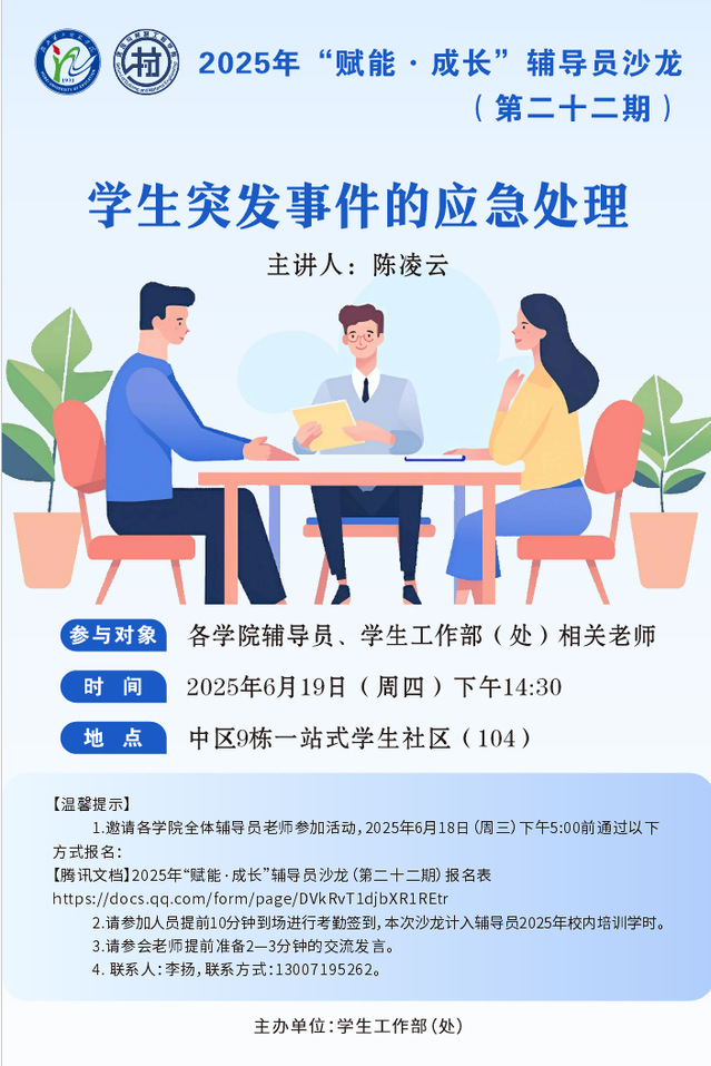 报名链接:【腾讯文档】2025年“赋能·成长”辅导员沙龙(第二十二期)报名表 https://docs.qq.com/form/page/DVkRvT1djbXR1REtr