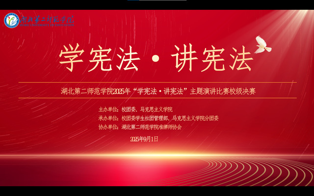本网讯(通讯员 李飒)为深入贯彻落实习近平法治思想,深化青少年宪法法治教育,推动宪法宣传教育活动广泛开展,9月1日下午,湖北第二师范学院2025年“学宪法·讲宪法”演讲比赛决赛于线上举行。校团委副书记张静、马克思主义学院党总支副书记李佳、学工部骆夏君、马克思主义学院学工办主任樊勇担任活动评委。马克思主义学院谭浩主持比赛。