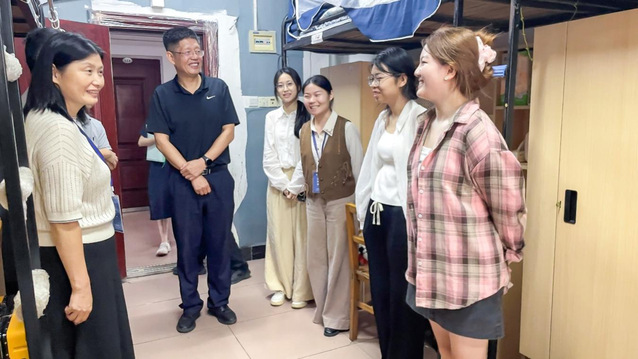 座谈会在温馨热烈的氛围中结束,全体与会人员合影留念。随后,刘昕与外国语学院领导班子、辅导员一同走访新生宿舍,实地了解学生生活环境,细致询问实际困难,并现场协调解决部分问题。