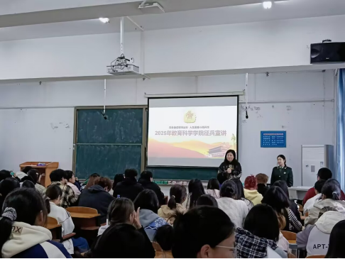 本网讯(通讯员 张亚琪)为积极响应国家征兵号召,鼓励大学生投身国防事业,近日,教育科学学院(以下简称“教科院”)分别于10401教室、阶梯教室1、阶梯教室3开展2026年春季征兵宣讲活动,号召广大青年学子“携笔从戎,勇担强军重任”。2022级教育学1班退伍军人潘思远担任主讲人,教科院辅导员龚敏出席此次活动。