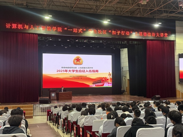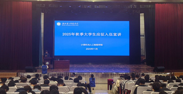 本网讯(通讯员 张煜)为深入贯彻习近平强军思想,积极响应国家征兵号召,激励青年学子投身国防事业,2025年11月13日,计算机与人工智能学院在学校大礼堂隆重举行2026年春季征兵动员宣讲会。学院征兵工作负责老师以及2025级全体新生共同参加了本次活动。