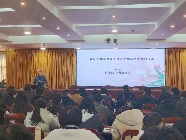 本网讯(通讯员 骆夏君 李诺)为加强辅导员队伍建设,提升育人实效,12月3日,学校“学思讲堂”第十五期特邀“时代楷模”“全国师德标兵”大连海事大学曲建武教授作专题报告。曲教授以《新时代辅导员角色定位与辅导员工作的开展》为题,为我校学生工作队伍带来精彩分享。