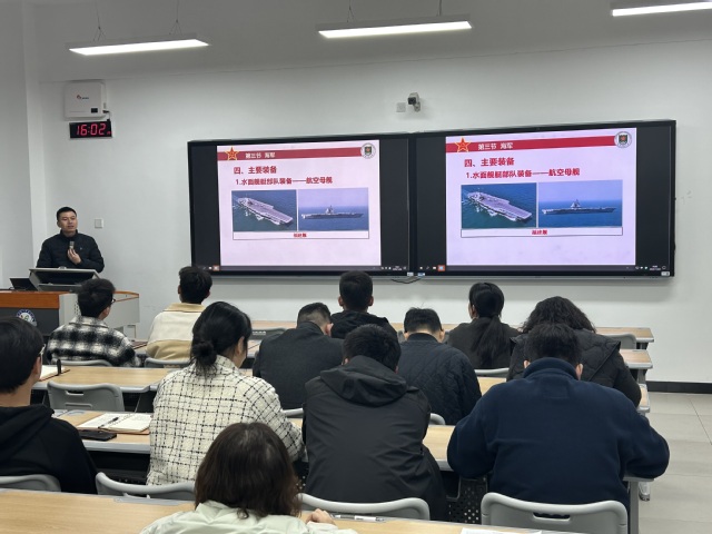 程鹏主任基于我国国防与军队建设的最新发展,为在场教师带来了一场内容丰富、见解深刻的专题讲座。他结合当前形势,聚焦我军组织架构与力量建设的新动态,对五大战区的使命任务、运行机制进行了更新解读,系统介绍了陆军、海军、空军、火箭军以及战略支援部队等军兵种在现代化建设进程中的最新发展、主战装备体系与核心能力,展现了我国国防科技实力的快速跃升和军队整体作战效能的显著增强。