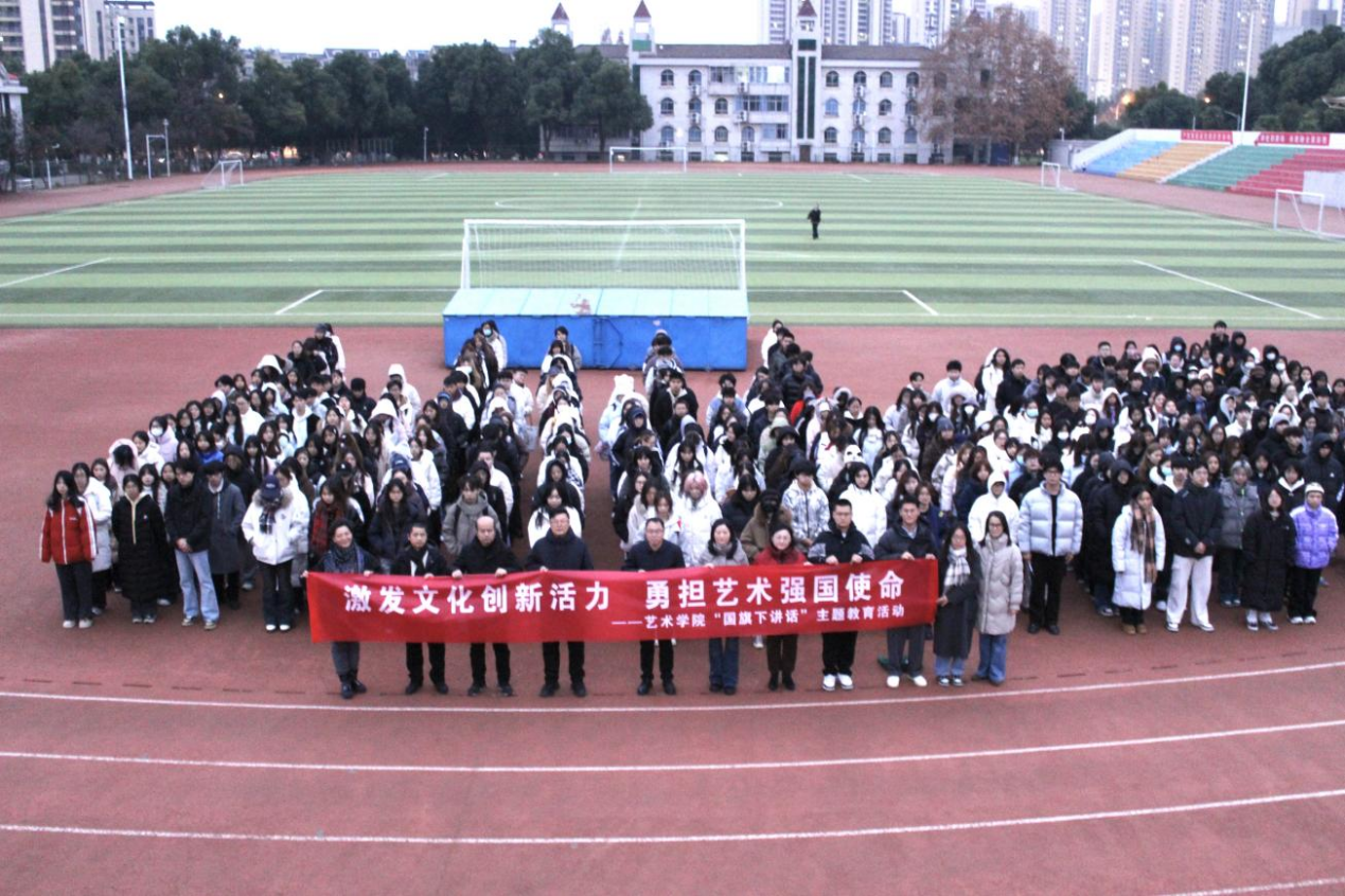 本网讯(通讯员 张子晗)12 月 22 日清晨,艺术学院在学校综合运动场举行“激发文化创新活力,勇担艺术强国使命”国旗下的讲话主题教育活动。校纪委、监察专员办公室主任龙涛、校团委书记刘锐、艺术学院领导班子、班主任代表、全体辅导员及 2025 级全体学生参与活动。