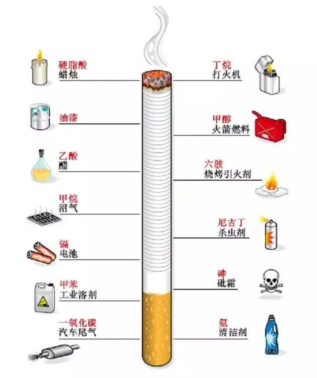 烟草烟雾中含有:7.357种化合物,其中至少69种致癌物,数百种有毒物质!