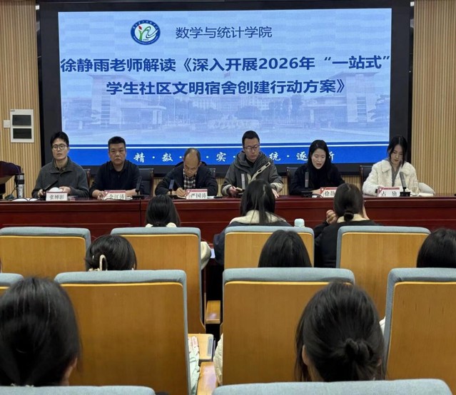 本网讯 (通讯员 何萌)为深入落实立德树人根本任务,扎实推进大学生文明素养提升行动,营造整洁有序、文明和谐的宿舍环境,3月23日,数学与统计学院(以下简称数统学院)于十号楼二楼会议室举行2026年大学生文明素养提升行动暨“一站式”学生社区文明寝室创建启动仪式。数统学院党委副书记严国涛,学工办主任余江涛,全体辅导员及各班学生代表参加本次活动。