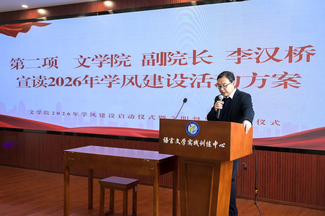 活动在庄严的国歌声中拉开帷幕。李汉桥宣读了《2026年学风建设活动方案》。他指出,面对当前教育和学术环境中的挑战与机遇,要激发师生内生动力,推动文学院朝着更高学术水准与教学质量迈进。随后,杨俊杰宣读了方案实施细则,优秀学生代表郑维希发言,强调了优良学风对个人成长和集体氛围的重要性。