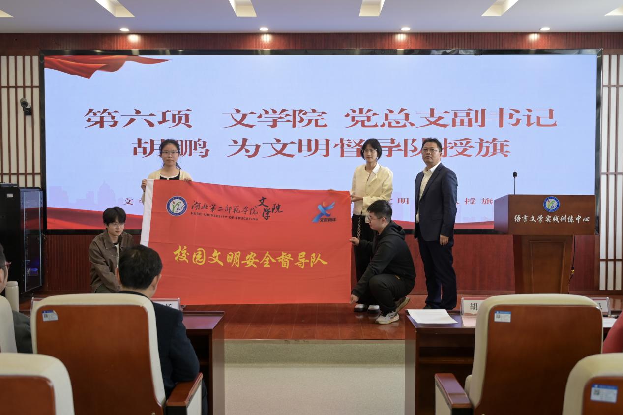胡鹏为校园文明安全督导队授旗