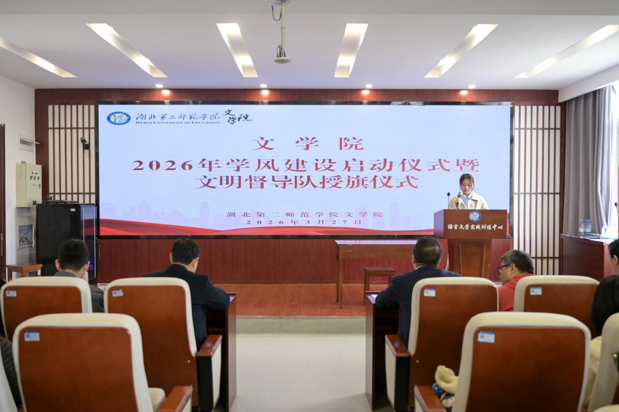本网讯(通讯员 龙梓祺)3月27日中午,文学院2026年学风建设启动仪式暨文明督导队授旗仪式在敬文师苑“一站式”学生社区文学剧场顺利举行。文学院党总支副书记胡鹏,副院长李汉桥,教学办主任陈思,学生工作办公室相关老师以及第二十五届分团委学生会全体成员参与此次活动,活动由文学院学生会文体部张安琪主持。